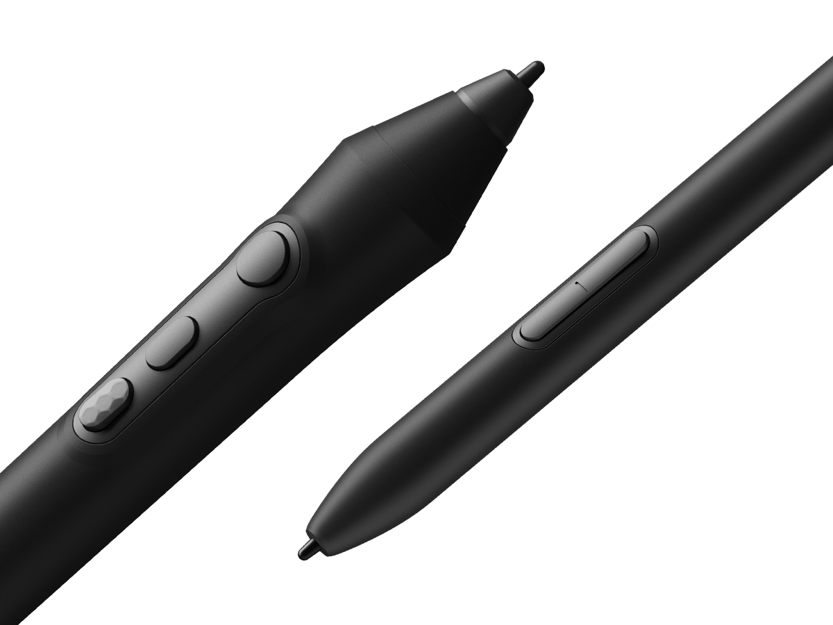 ペンのサイズは、手の大きさや好みに合わせて2種類用意しました。1本は3ボタン、もう1本は2ボタンで、それぞれ消しゴムがついています。3ボタンペンは、3D作品や、より多くのボタンを使いたいアーティストに特におすすめです。ペンはユーザーの好みの感度に合わせることができ、初期起動の筆圧は3gまで調整可能です。