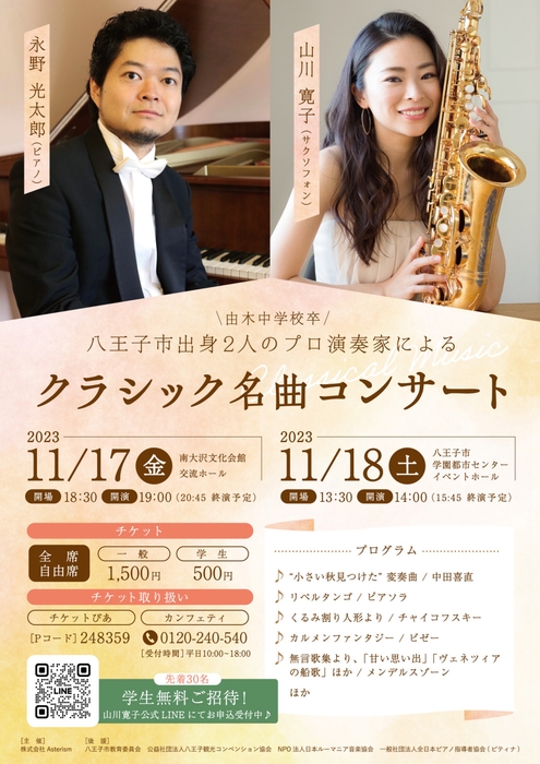 八王子市出身・八王子市由木中学校卒業の、山川寛子(サクソフォン)と永野光太郎(ピアノ) 2人のプロ演奏家が、地元への恩返しコンサートを開催。