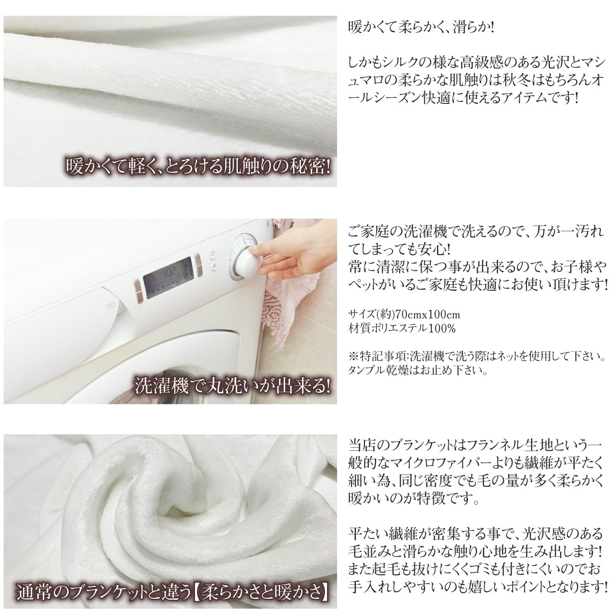 ブランケットの素材には、フランネル生地を使用しており、起毛された柔らかな表面が特徴的で、肌触りが非常に滑らかです。この生地は、繊細な織りで構成されており、空気を多く含むことから優れた保温性を持っています。また、軽量でありながらも温かみがあり、冷え込む季節に適しているため、寒い日には体を優しく包み込んで暖かさを提供します。フランネルは通気性も良く、汗をかいても肌にまとわりつかず、快適に使用できるのが魅力です。また、その耐久性と洗濯機での洗いやすさもフランネル生地の大きな利点の一つです。これにより、日常的に使いやすく、長持ちするブランケットとして理想的です。