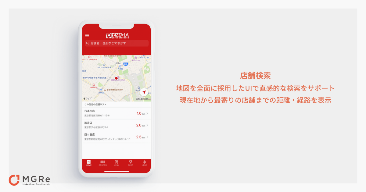 店舗検索メニューでは、地図を全面に採用したUIで直感的な検索をサポート。最寄りの店舗までの距離・経路の表示、現在地からの距離順に店舗リストを表示など、お持ち帰りのお客様向けにも便利な地図機能を備えています。