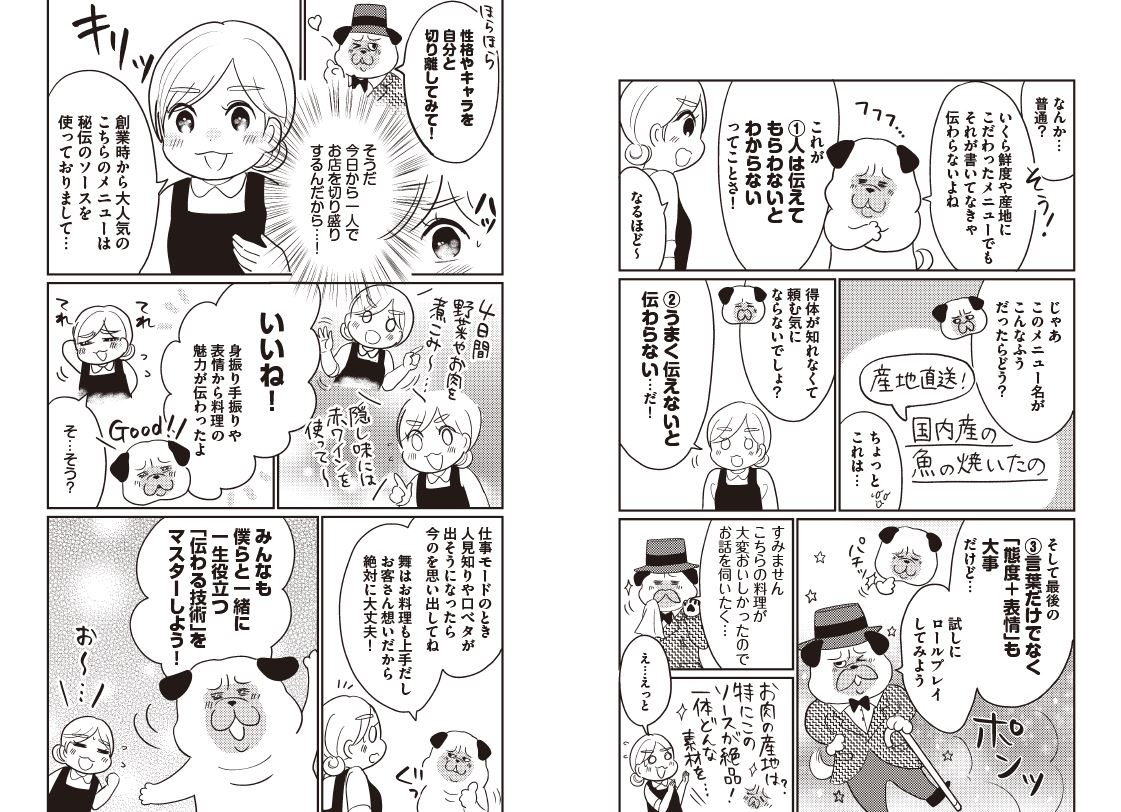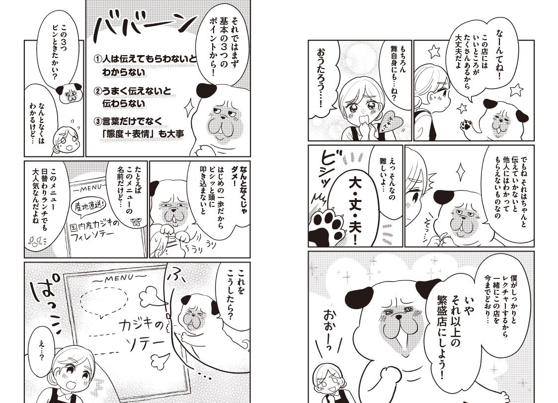 一人と一匹のキュートなコンビが「36の伝わる法則」を駆使し、試行錯誤しながらもお店を繁盛に導いていきます。
