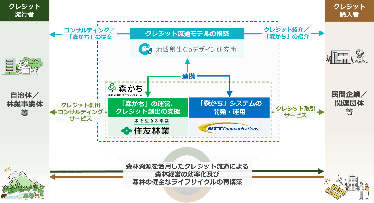 株式会社地域創生Coデザイン研究所(代表取締役所長:北山 泰三、以下 「地域創生Coデザイン研究所」)は、カーボン・クレジットの創出・流通による脱炭素社会の実現に向けた取り組みの一環として、住友林業株式会社(代表取締役社長:光吉 敏郎、以下 「住友林業」)、NTTコミュニケーションズ株式会社(代表取締役社長:小島 克重、以下 「NTT Com」)と連携のうえ、森林価値創造プラットフォーム(以下 「森かち」)※1を活用した森林由来J-クレジット※2の創出・販売・購入の支援を開始いたします。