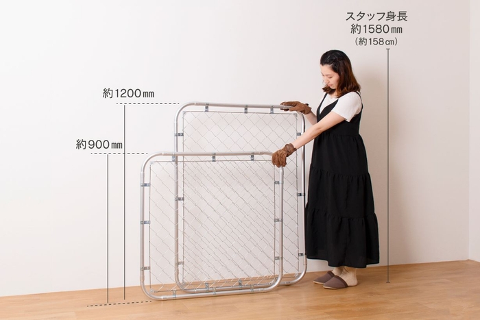 900×900mmサイズで約2kg!既製品のアメリカンフェンスと比べて軽い仕様になっています。組立・解体ができる