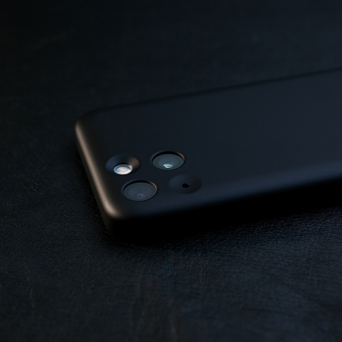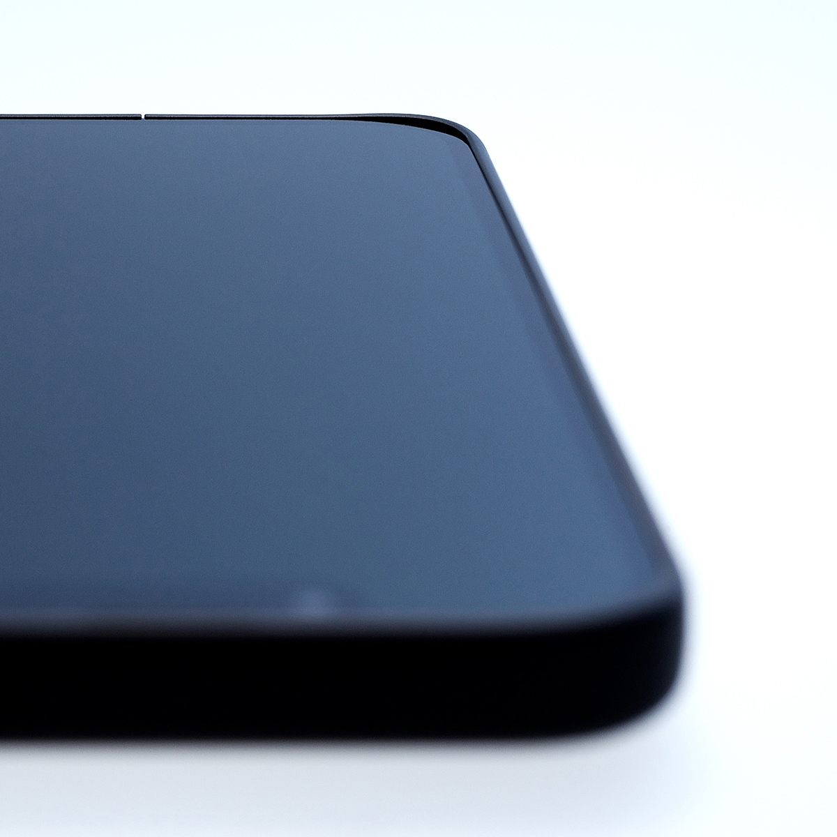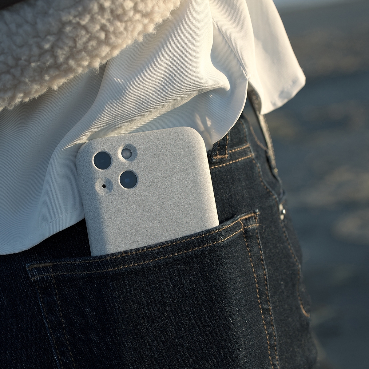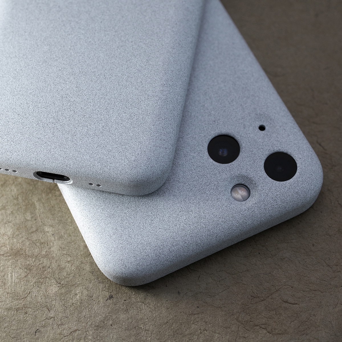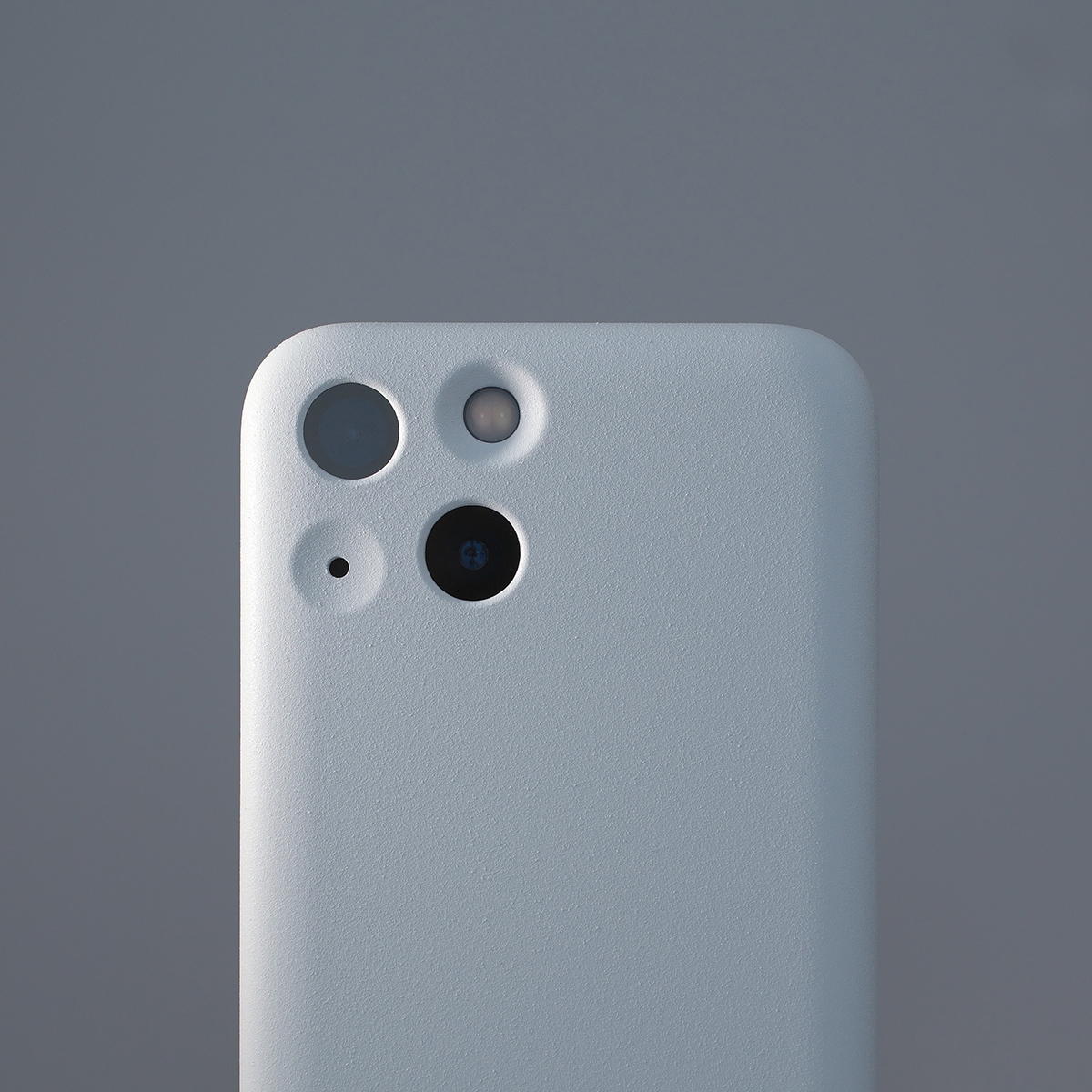 複雑な形状のリアカメラ部、ボタンやパーツの分割ラインなどの煩雑な要素をすべて覆い隠すことで、ミニマルでシンプルなデザインを実現しています。