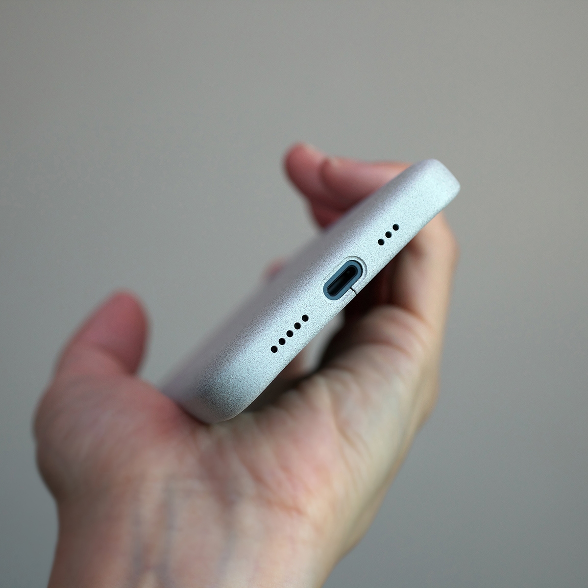 ケース背面は机に置いてもがたつかないようにリアカメラが接地しない厚みを持たせています。握った際に手が触れる部分は非常に薄く設計しているため、ケースをつけていることを感じさせません。角のRを大きくし滑らかな背面形状にすることで握り心地を良くしています。