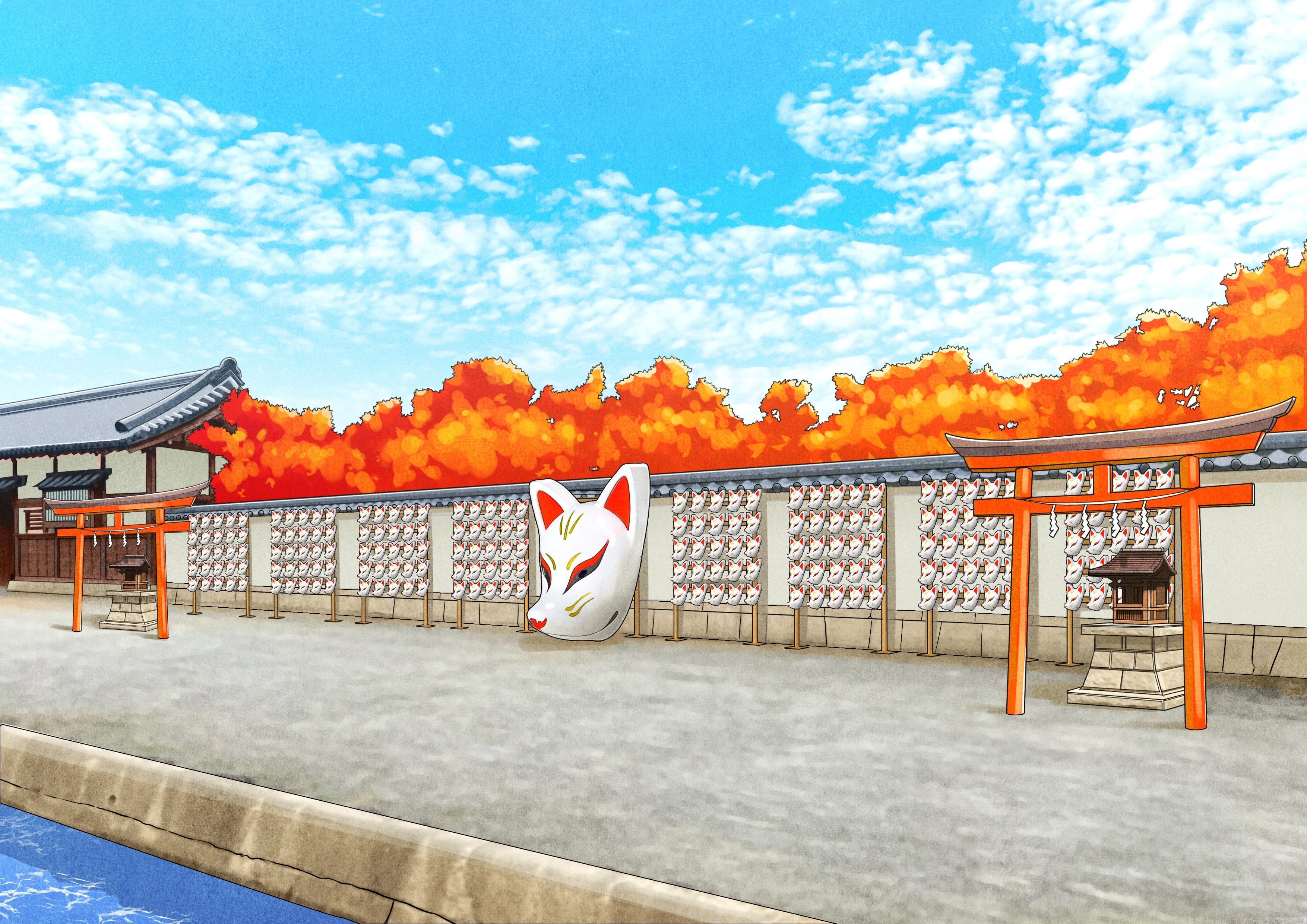 今、映画村や京都の観光地では狐面が大人気です。映画村のハロウィンにやってくるのも、魔女やお化けではなく、「きつね」。