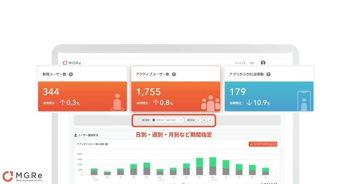 メグリ株式会社が提供するアプリの企画・開発から運用までワンストップでマーケティングを支援するアプリマーケティングプラットフォーム「MGRe(メグリ)」は、ダッシュボード機能をアップデートいたしました。MGReで取得したアプリユーザーの行動データを「新規ユーザー」「アクティブユーザー」「アプリからの送客状況」の3つのカテゴリから各種データの閲覧・分析が可能になります。さらに、アプリ運用における定番施策を簡単に確認・実行できる「アクションボード機能」も追加いたしました。