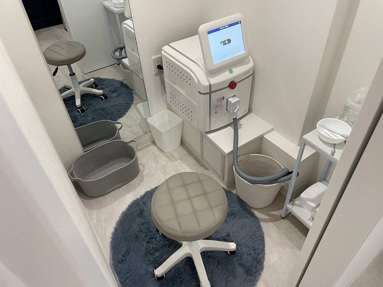 別の事業体のお店にも『SELF ONE』は納品実績が多数ございます。例えば日焼けサロンでも脱毛やカフェでの脱毛など、今までになかった場所のちょっとした空きスペースをセルフ脱毛サロンの空間として活用できることで、そのセルフ脱毛が新規顧客の獲得に役立ったり、既存顧客様がセルフ脱毛をご利用して頂いたりと、相乗効果を発揮しております。マシンと鏡や椅子などの簡易的なスペースでも十分にセルフ脱毛が行えるため、内装工事の必要がなく、工事せずにセルフ脱毛が開始できたことが喜ばれております。少しのスペースに活用に、マシンを納品するだけで使用することができるコンパクト設計の為、手軽にエステメニューを追加できるのが利点となります。