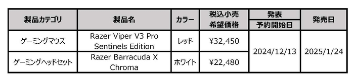 ゲーマー向けライフスタイルにおける世界のリーディングブランドのRazer(TM) (本社: 米国 カリフォルニア州およびシンガポール、共同創業者兼CEO:Min-Liang Tan)は、VALORANT プロ選手使用率No.1マウス「Razer Viper V3 Pro」の新色「Razer Viper V3 Pro Sentinels Edition」と軽量ワイヤレスヘッドセット「Razer Barracuda X Chroma (White Edition)」の計2製品を2024年12月13日(金)より国内正規流通代理店 MSY株式会社を通じて、全国の家電量販店、PCショップ、オンラインショップ等で予約開始いたしました。販売開始は2025年1月24日(金)を予定しています。
