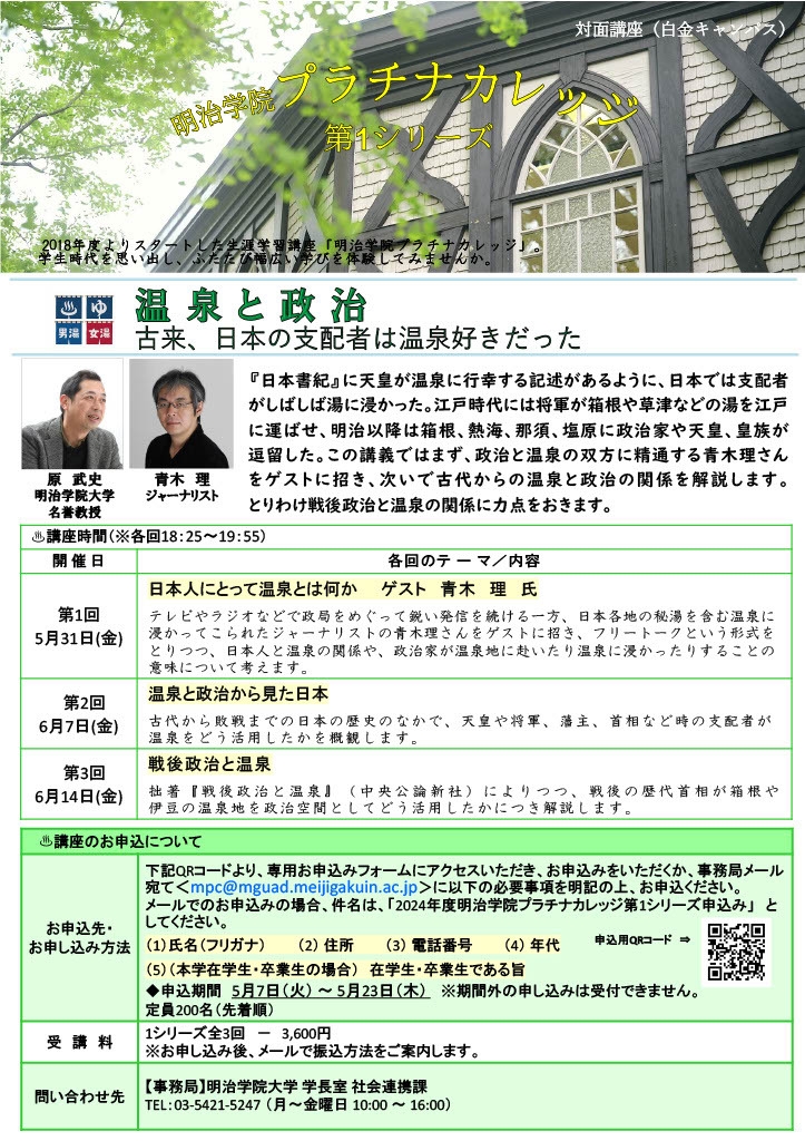 明治学院大学が2024年度生涯学習講座 「プラチナカレッジ」を5月に開催 第1シリーズは全3回にわたり明治学院大学名誉教授 原武史氏が登壇 第1回はジャーナリストの青木理氏がゲスト ~ 温泉と政治 古来、日本の支配者は温泉好きだった ~