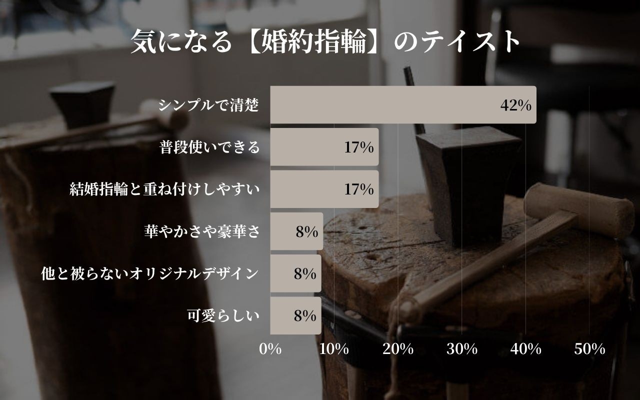 「シンプルで清楚」が42%と圧倒的に支持され、上品で飽きのこないデザインが選ばれる傾向が強まりました。「普段使いできる」「結婚指輪と重ね付けしやすい」も各17%で続き、実用性とのバランスも重視されています。一方で「華やかさ」や「可愛らしさ」は8%にとどまり、デザインはシンプルで普段使いしやすいものが選ばれる傾向にあるようです。
