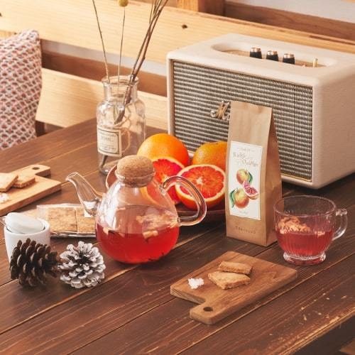 ティートリコの代名詞である食べられるお茶「TeaEAT(R)ティート」は、数種類のドライフルーツと紅茶葉の代わりに食用ハーブ類のみを選別してハーブ茶葉として用い、ブレンドした果実茶(フルーツティー)です。ノンカフェインで、飲んだ後もフルーツをすべて召し上がっていただくことの出来るサスティナブルなティートは大切な人への贈り物としてもおすすめです。