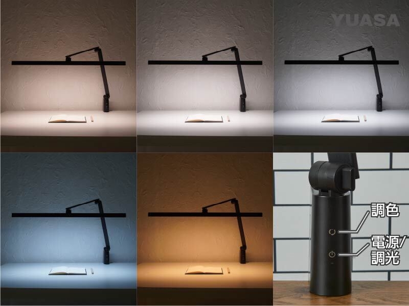 調光は中間色・白色・昼白色・電球色・温白色の5種類のカラーをベースに、操作部のタッチ切替と長押しでの無段階調整ができ、より使用環境に合わせて使える目にやさしいデスクライトです。