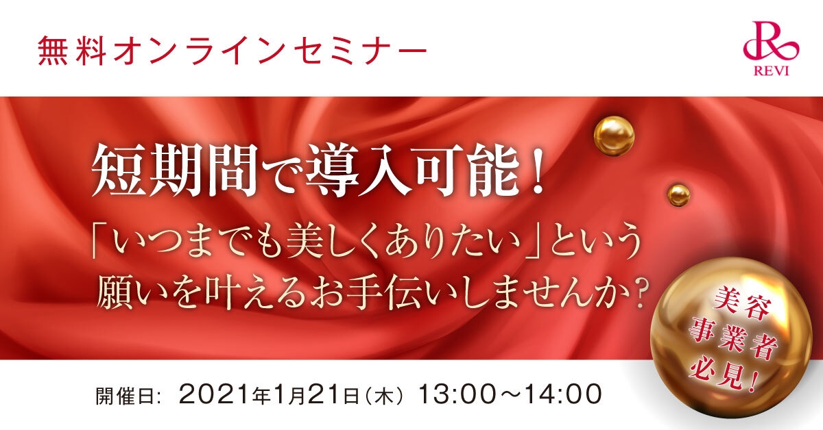 ◆1月21日(木)無料セミナー◆初のオンライン開催!美容事業者必見! 次世代フェイシャルスキンケア商材【REVI(ルヴィ)】の代理店募集。「いつまでも美しくありたい」という願いを叶えるお手伝いしませんか?