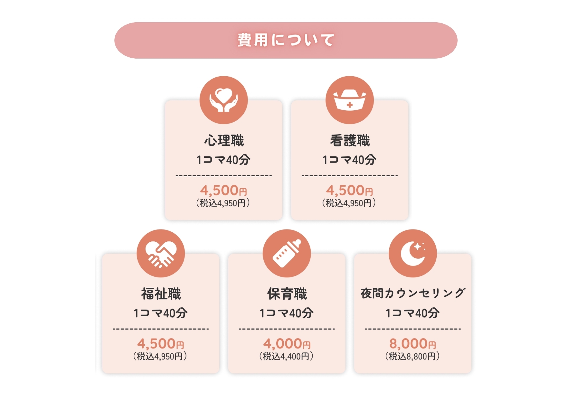 NOALONは国家資格保有者のみ在籍しております。心理系(臨床心理士、公認心理師)、看護系(助産師、保健師、看護師)、福祉系(精神保健福祉士、社会福祉士)、保育系(保育士、管理栄養士)の専門職がそれぞれの得意分野で相談に応じます。