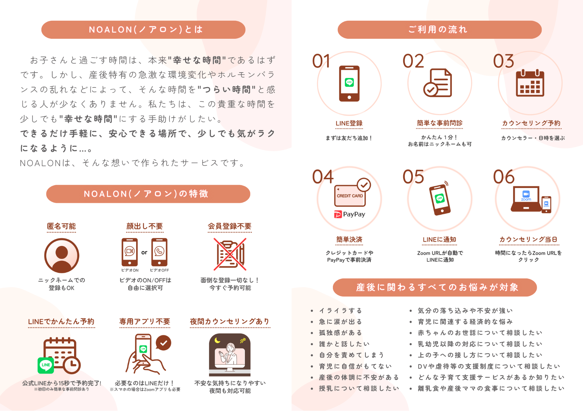 こうしたきっかけで、産後・育児特化型オンラインカウンセリングサービス「NOALON(ノアロン)」を立ち上げました。私やNOALONのカウンセラーは、「産後の貴重な時間を少しでも“幸せな時間”にする手助けがしたい」という気持ちで、このサービスに取り組んでいます。