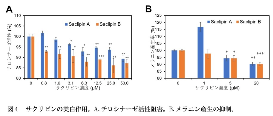 紫外線照射ストレスを受けると、メラニン色素の合成が促進されてシミの原因となります。メラニンはメラノサイトと呼ばれる細胞中で、チロシナーゼ(注10)という酵素のはたらきによって生産されます。本研究により、サクリピンがチロシナーゼの活性を阻害し、マウスのメラノサイト由来培養細胞におけるメラニンの産生を抑制することを突き止めました(図4)。チロシナーゼ活性については、サクリピンAよりもサクリピンBが強い阻害作用を示しました。これらの結果は、サクリピンがシミの形成を抑制する美白剤としての機能を有することを示唆しています。