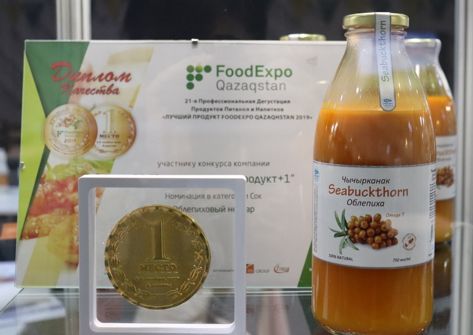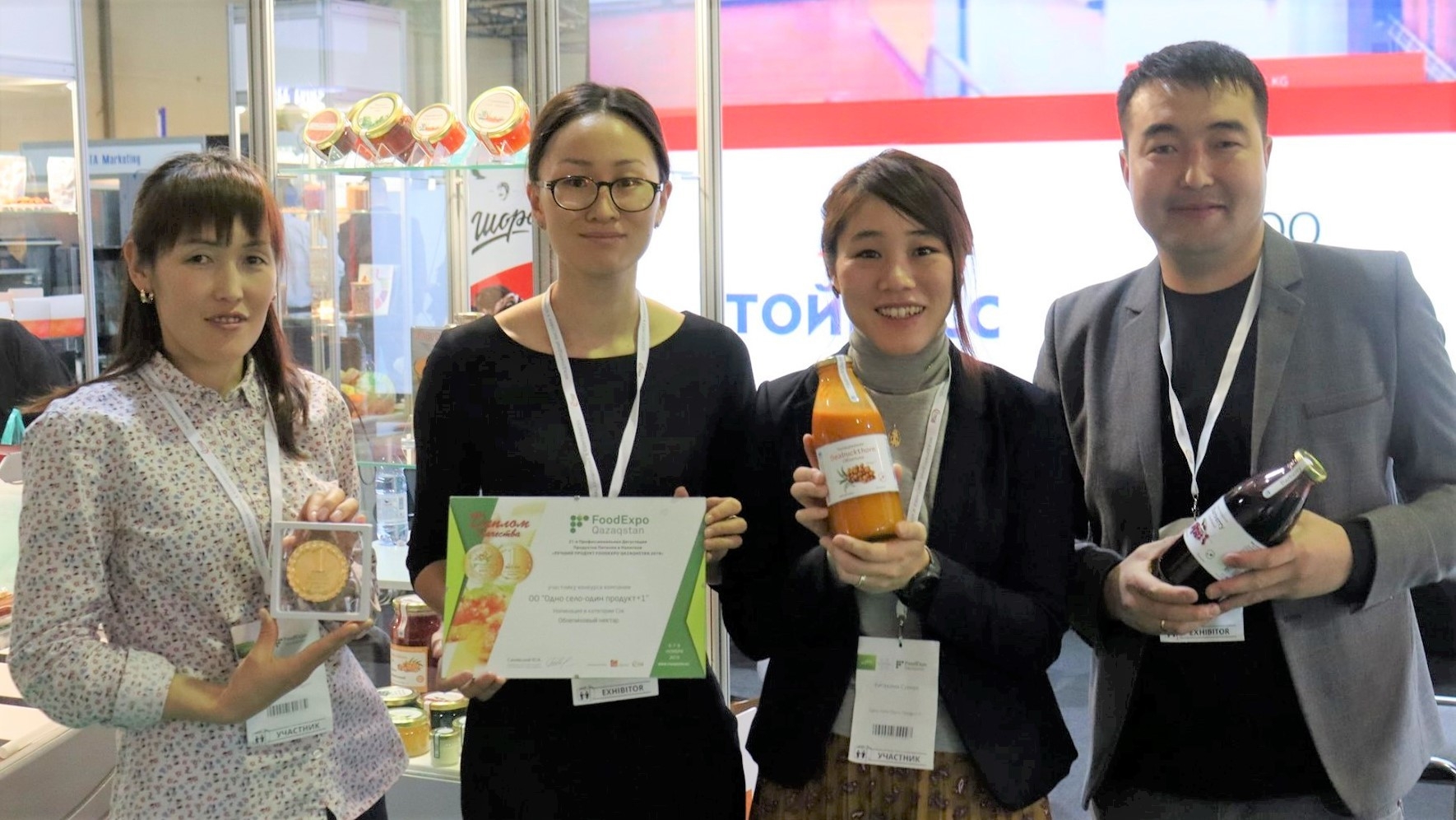 2018年11月6日から8日までの日程でカザフスタンで開催されたフードエキスポ国際展示会に出展しました。この展示会には、カザフスタン、ロシア、トルコ、インド、中国、韓国、ドイツ、キルギスタンから300社が参加しました。展示会においては、コンテストも行われ、「ベストテースト」部門において、シーバクソンジュースは金メダルを獲得しました。