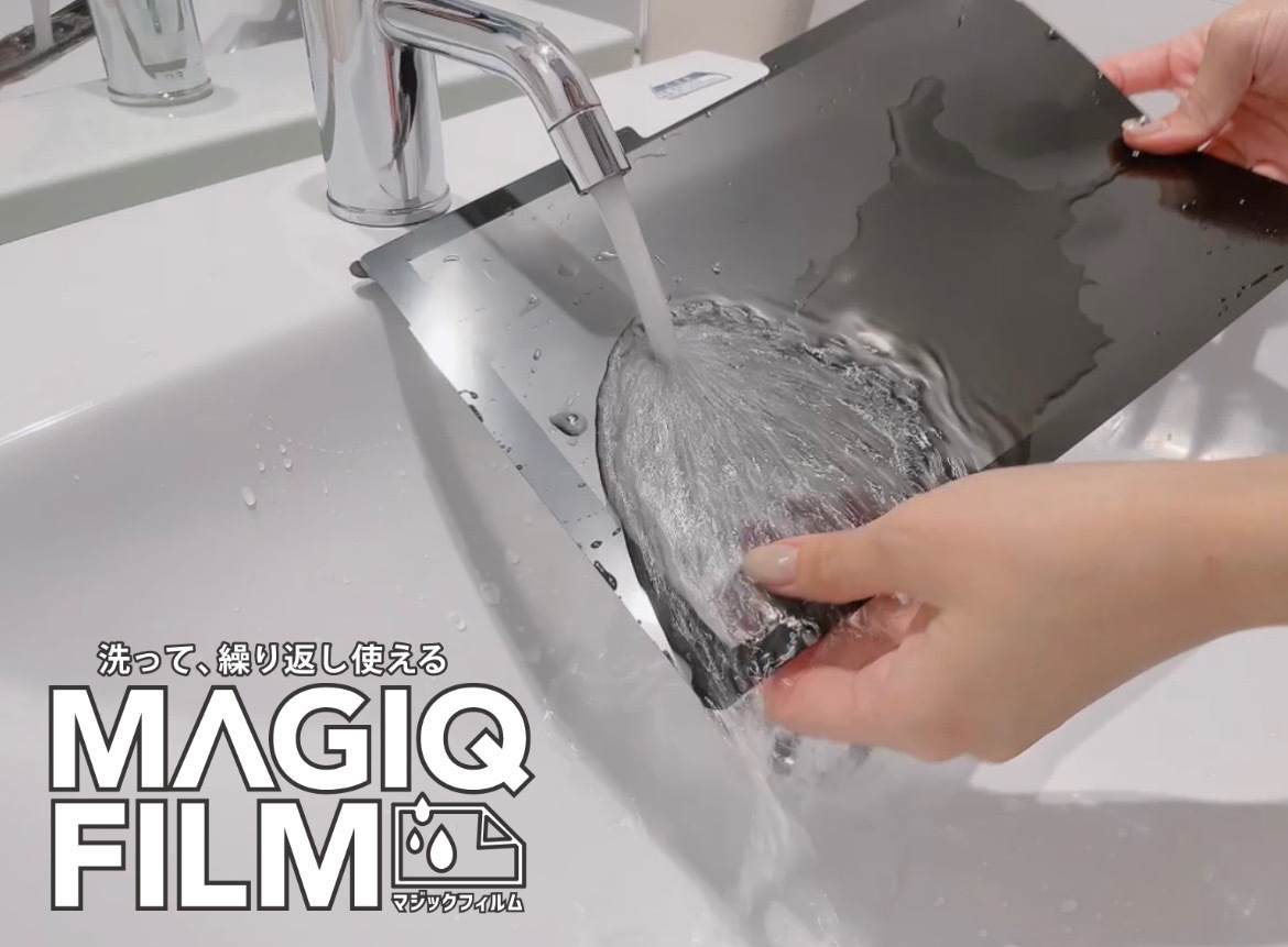 マジックフィルムは、今までの保護フィルムの概念を覆すような商品です。最大の特徴はフィルム自体を水洗いができること。水洗いをすることで吸着部分に付いていた埃を除去でき吸着力が復活。そのため吸着力を保ったまま何度も貼り直しができるという仕組みです。