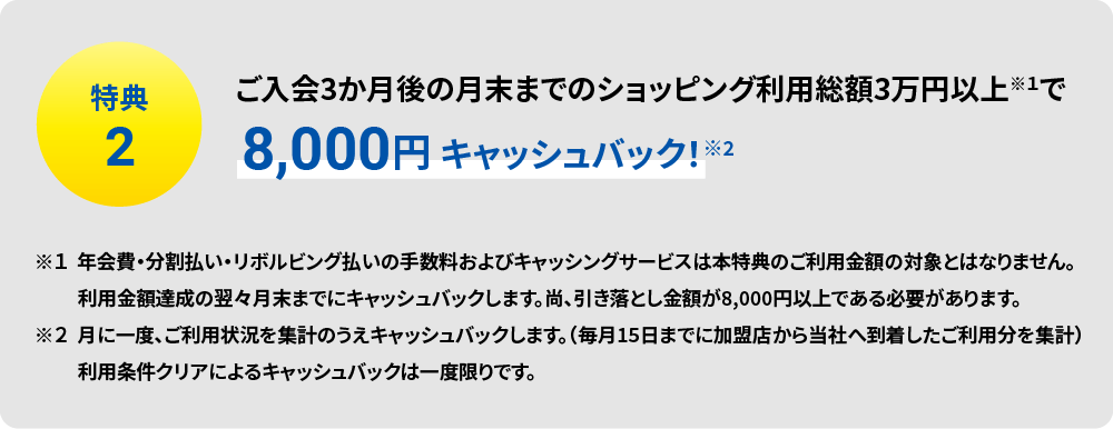 ②カードショッピング合計3万円以上ご利用で8,000円キャッシュバック!