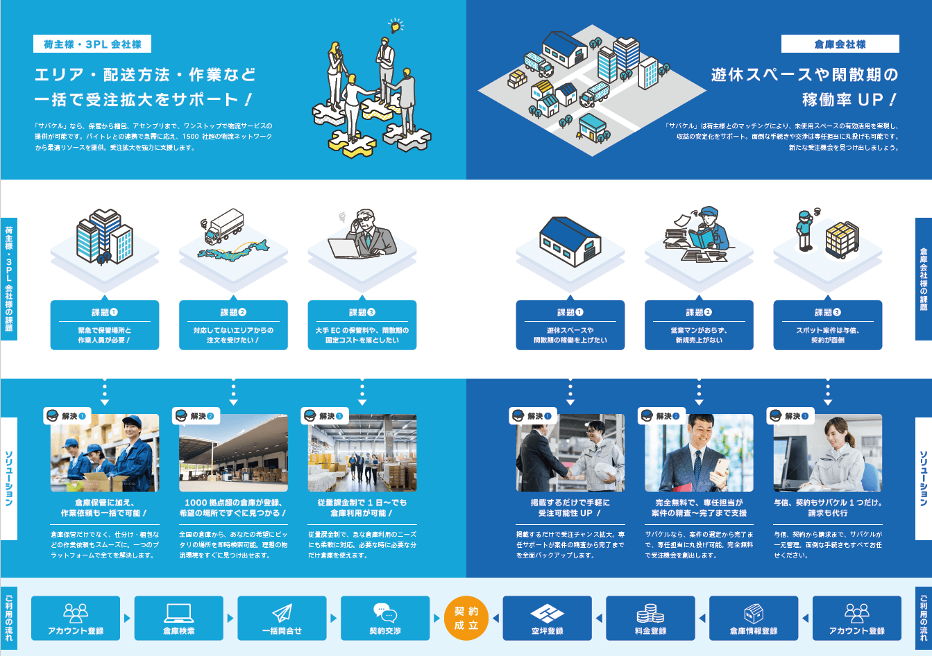 「サバケル」は、倉庫の空きスペースを有効活用するために、荷主や3PLなどの物流企業と倉庫を効率的にマッチングするサービスです。