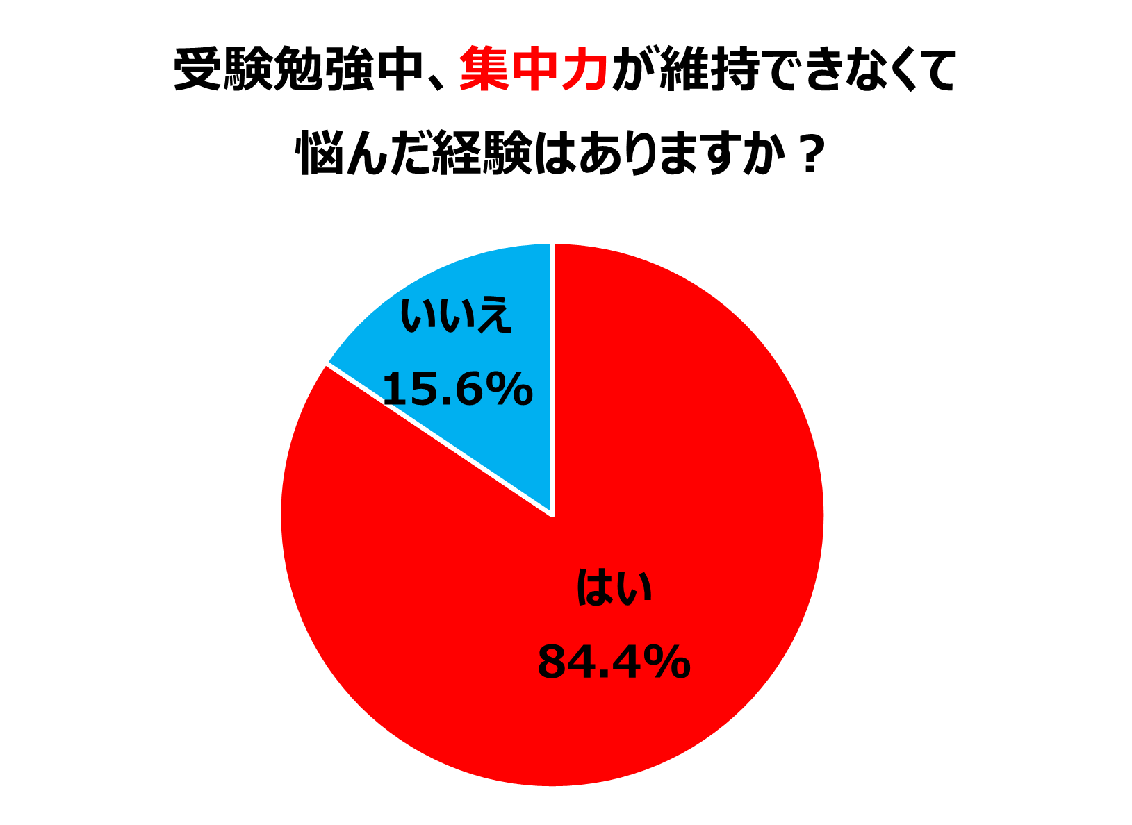 次に、受験勉強中に集中力が維持できなくて悩んだ経験について尋ねると、「はい」と答えた人は実に84.4%にも及びました。集中力の欠如は受験勉強の大きな天敵とも言えますが、多くの人が集中力の維持に悩みを抱え、受験勉強がはかどらない経験をしていることが分かりました。