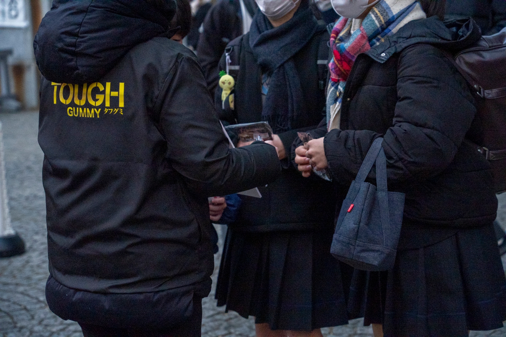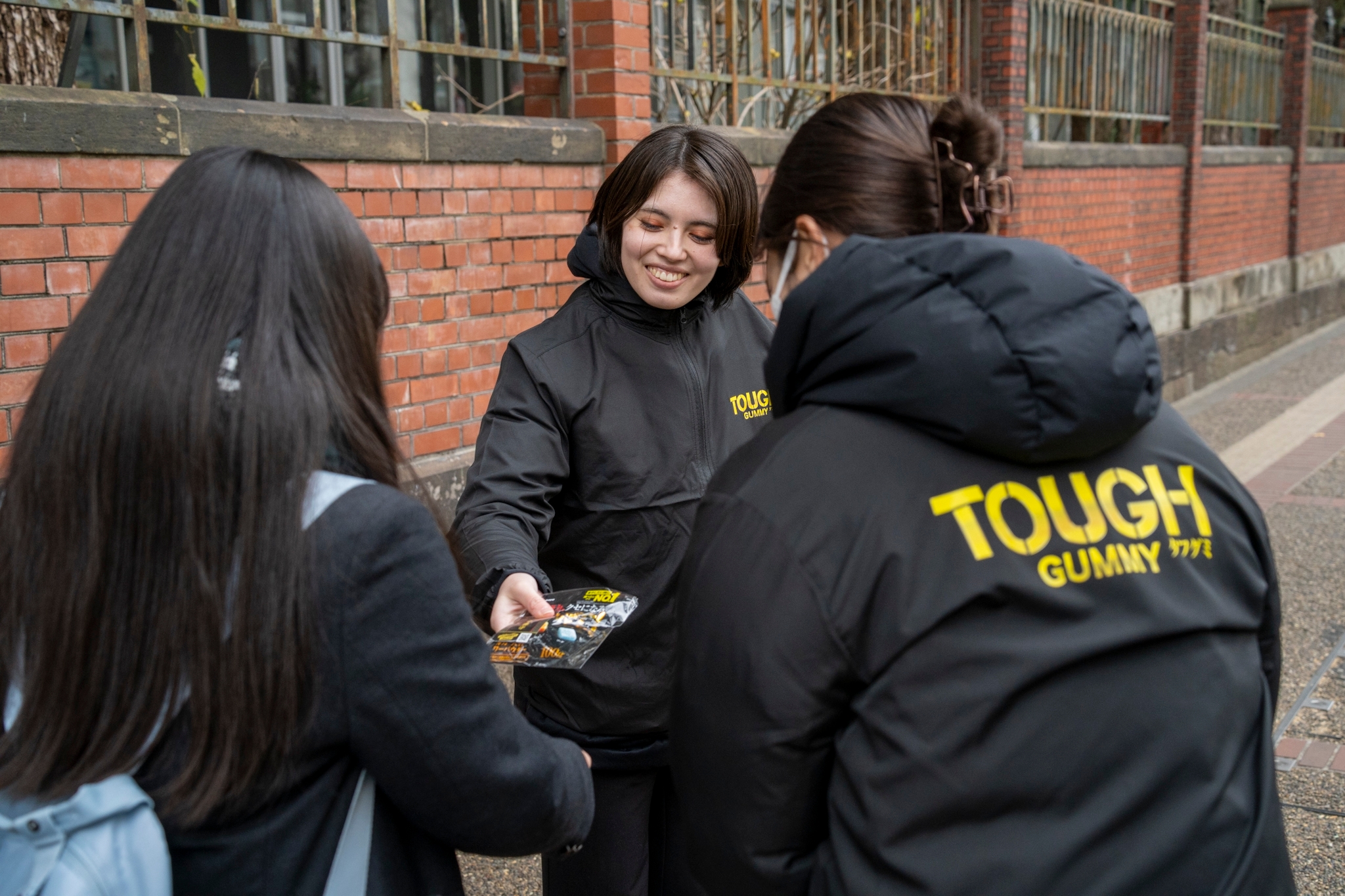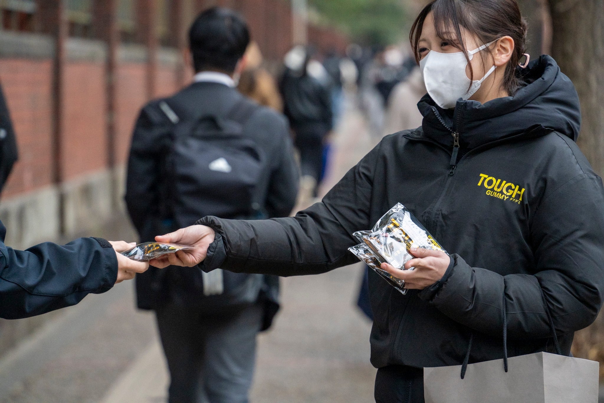 2025年1月18日(土)と19日(日)に共通テストが行われた東京大学本郷キャンパスと横浜国立大学常盤台キャンパスの試験会場周辺にて、試験後の受験生たちに向けて、『タフグミ』と集中御守ステッカーのサンプリングを実施しました。一時的に緊張がほどけた表情や、気持ちを引き締め直す表情など、様々な面持ちで会場を後にし、これから帰宅して自己採点をしたり、二次試験の対策をしたり、まだまだ集中力を切らすことができない“タフ組”の皆さん一人ひとりに、応援の気持ちを込めて手渡しました。ご自分のことだけでも手一杯であろう中、今回のサンプリング品のお渡しに対し、「ありがとうございます」という温かい言葉と笑顔を返してくださった受験生が多かったことが特に印象的でした。皆様の努力が実を結び、明るい春が訪れんことを心から願っています。