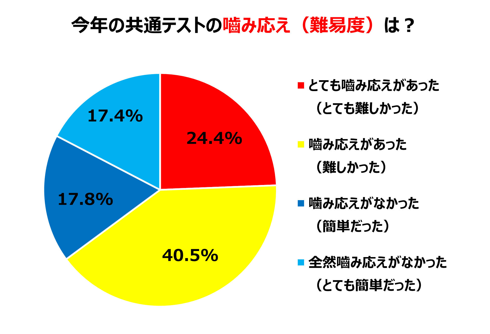 試験直後の受験生に実施した「共通テストの“噛み応え” アンケート」では、今年の共通テストの“噛み応え”(難易度)は、24.4%の人が「とても噛み応えがあった(とても難しかった)」と回答しました。「噛み応えがあった(難しかった)」と合わせると、64.9%の人が、今回の共通テストに“噛み応え”を感じていました。