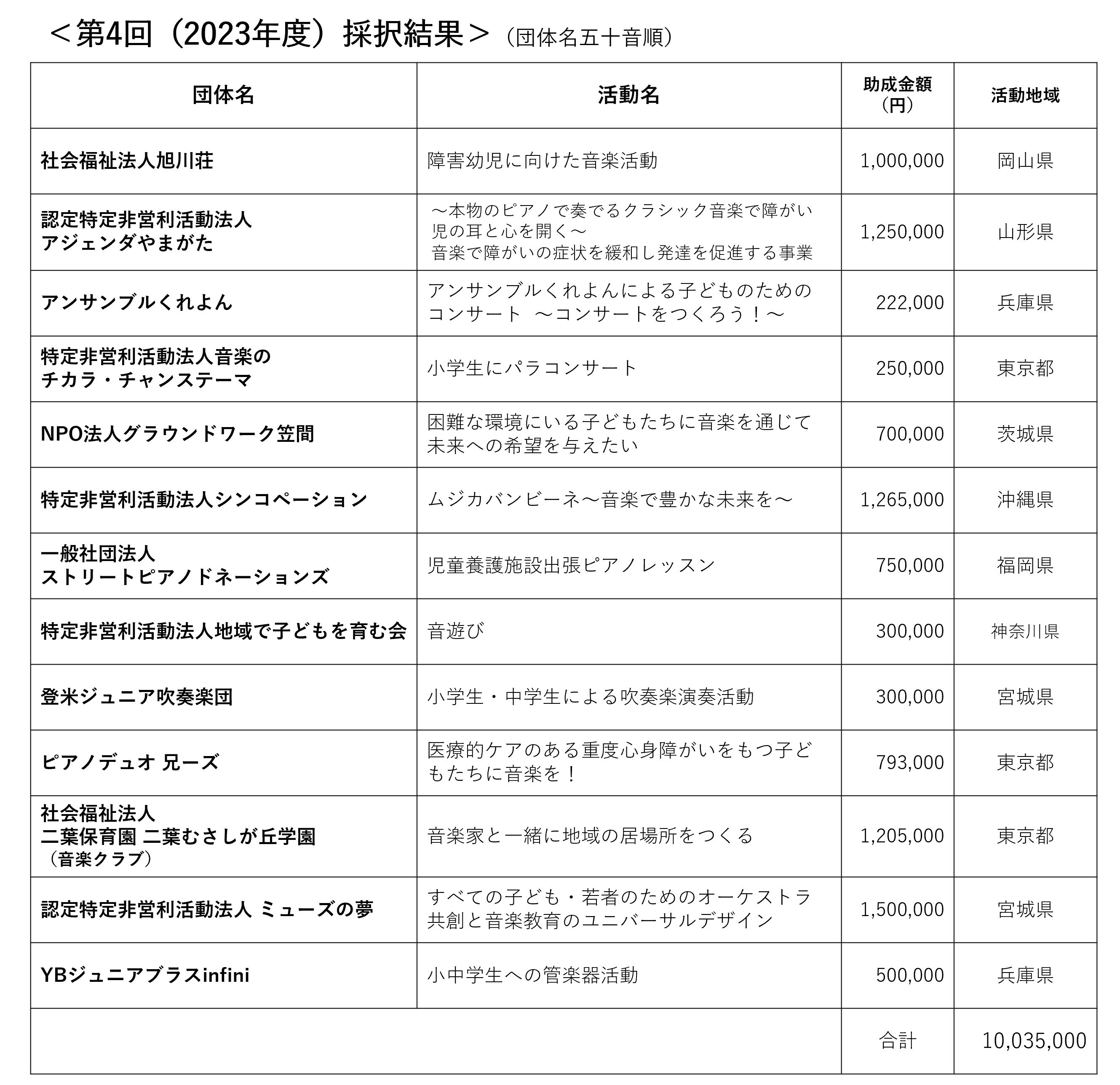 公益財団法人ソニー音楽財団(所在地:東京都千代田区、理事長:水野 道訓)は、「ソニー音楽財団 子ども音楽基金」第4回(2023年度)助成において、「子どもたちへの教育を目的とした音楽活動に取り組んでいる団体」の活動へ、計13件、総額10,035,000円の助成を決定しました。