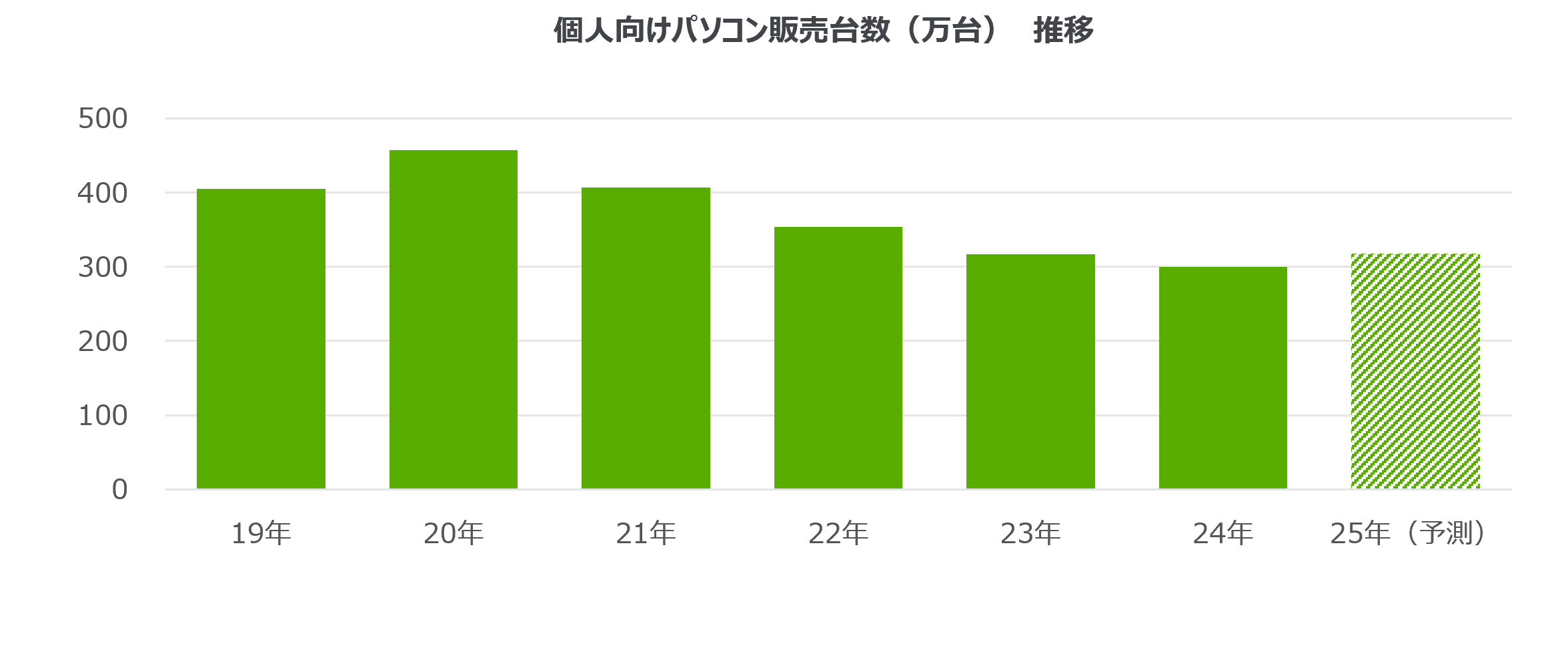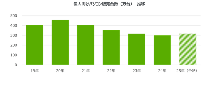 25年の個人向けPC市場は前年比6%増の320万台と、5年ぶりのプラス成長に転じると予測する。前述のWindows 10のサポート終了に伴う買い替え需要に加えて、20年のコロナ禍特需で購入されたPCが約5年を経て買い替えのタイミングを迎えることも需要を下支えするとみられる。さらにコロナ禍を経て定着した、高画質動画のストリーミング視聴、オンラインゲーム、行政手続き・ネットバンキングなど、変化したライフスタイルに対応するためのPC性能向上も、市場回復を後押しするだろう。