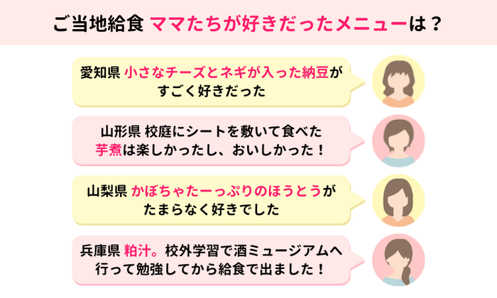 今回のアンケートでは、東京や大阪といった大都市部出身の人たちからは、具体的なご当地給食メニューがあがりませんでした。自治体の規模が大きくなるほど、ご当地給食が見られなくなるのかもしれません。