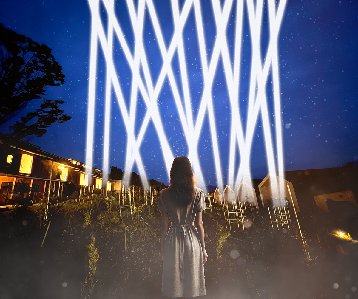 光の森を歩くような体験の中、無数の動く光柱が形成するやぐらが出現。