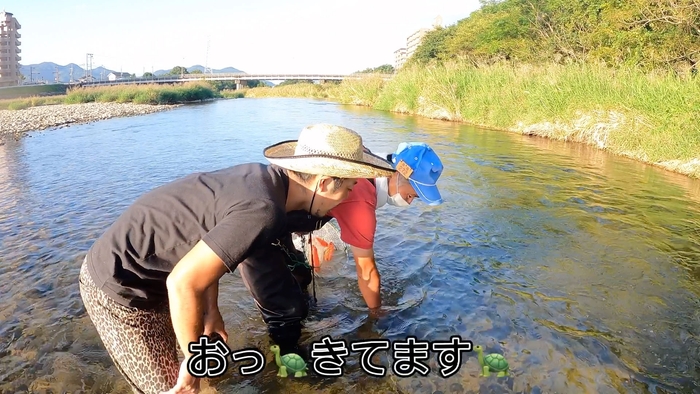 翌日、仕掛けのチェックに向かう岡田さんと與座。フナやナマズも仕掛けに引っかかっていますが、今は必要ないため無駄には獲らず、川に返します。一つ一つ仕掛けを確認していき、そしてついに、すっぽんが!