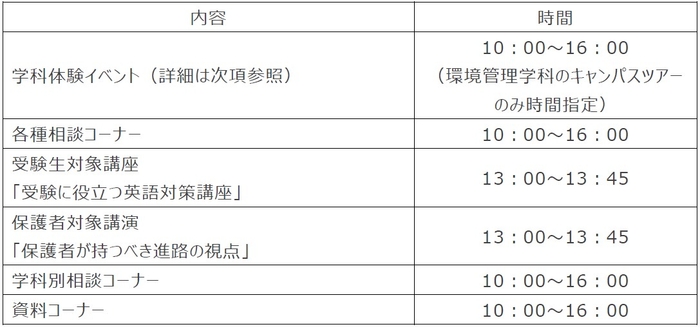 近畿大学農学部のオープンキャンパスでは、「あなたの未来に彩ノウ(さいのう)を」をテーマに、農学部6学科それぞれの特色を生かした学びを体験できるイベントや学科紹介を行います。また、受験生対象の「受験に役立つ英語対策講座」や、保護者を対象とした講演「保護者が持つべき進路の視点」の開催、学生生活や進路についての各種相談コーナーを設置し、高校生の進路決定をサポートします。