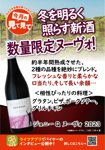 “おいしい” “ワクワク” “ハッピー” をお届けするライフコーポレーションは、立冬ヌーヴォである「ジョニー Q ヌーヴォ」を11/4(土)より数量限定で販売しております。