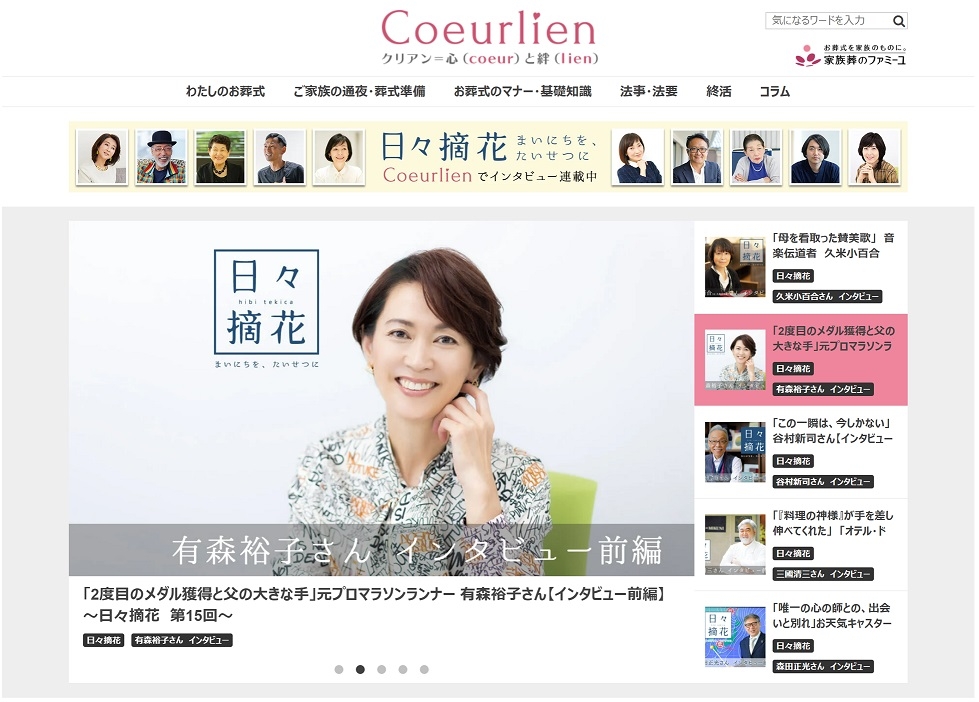 エンディング ノートの書き方、生前の遺影撮影、葬儀でのマスクの色など、終活やお葬式のお役立ち記事から、大切な人との別れを著名人が語るインタビュー連載「日々摘花」まで、生活者目線でライフエンディング情報をお届けするWEBメディアです。サイト名は、フランス語の"coeur"(心)と"lien" (絆)を繋いだ造語。家族の絆、人との絆のバトンを繋ぐきっかけになりたいという願いを込めています。