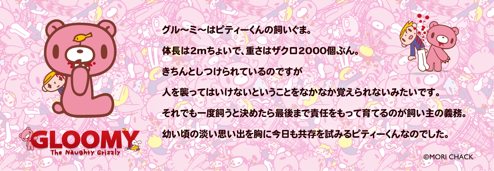 世の中に存在する“クマ”をモチーフにしたキャラクターはかわいいものがほとんど。グル~ミ~は、見た目はピンクでかわいいが、実際、クマは本能により凶暴であるということをシニカルかつユーモラスに表現したキャラクター。