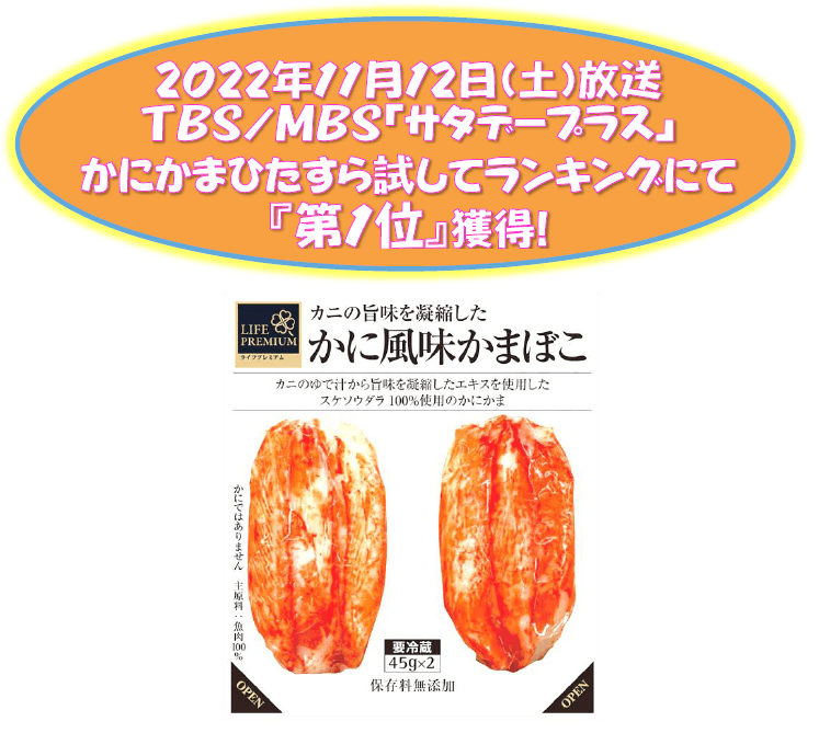カニのゆで汁から旨味を凝縮したエキスを使用しており、かにの風味をリアルに再現した「かに風味かまぼこ」。昨年11月にTBS/MBS「サタデープラス」にておいしいかにかまを決める“かにかまランキング”にて、「まるで本物のかにのような味わい!」「おいしい!」と評価いただき『第1位』を獲得いたしました。放送後約1カ月で8万個を販売し、リピート率も脅威の13.8%(※2)と、ライフプレミアム史上の大ヒット商品となりました。