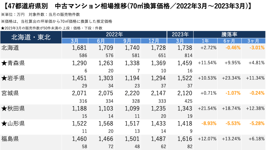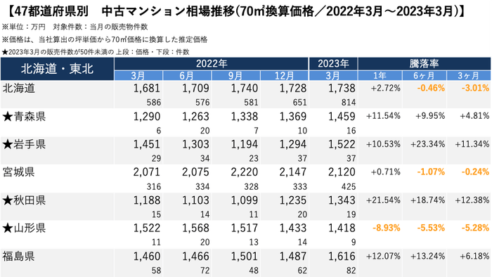 *1 当社が保有する中古マンションの販売履歴データを元に「坪単価」を算出し、70㎡での価格に換算した推定価格。*2 当月(2023年3月)の販売件数。