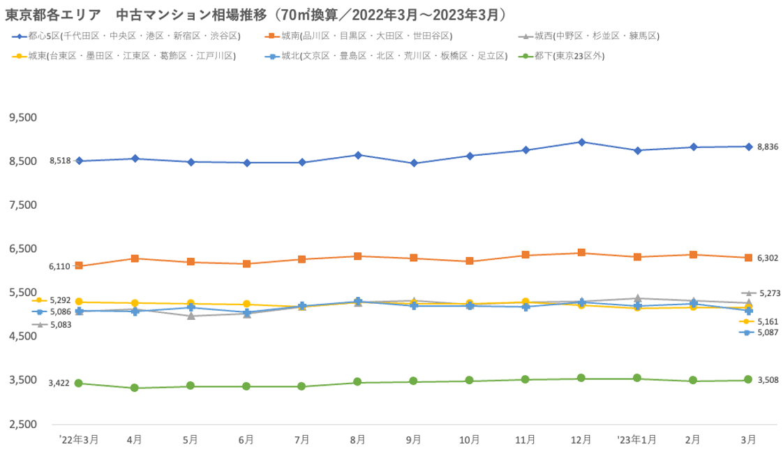 ・首都圏で推定価格がトップのエリアは「都心5区(千代田区・中央区・港区・新宿区・渋谷区)」で、2023年3月の推定価格は8,836万円。