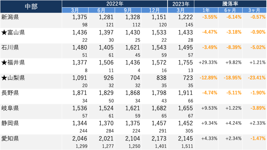価格:「愛知県」 2,145万円/騰落率:「岐阜県」 +9.53%