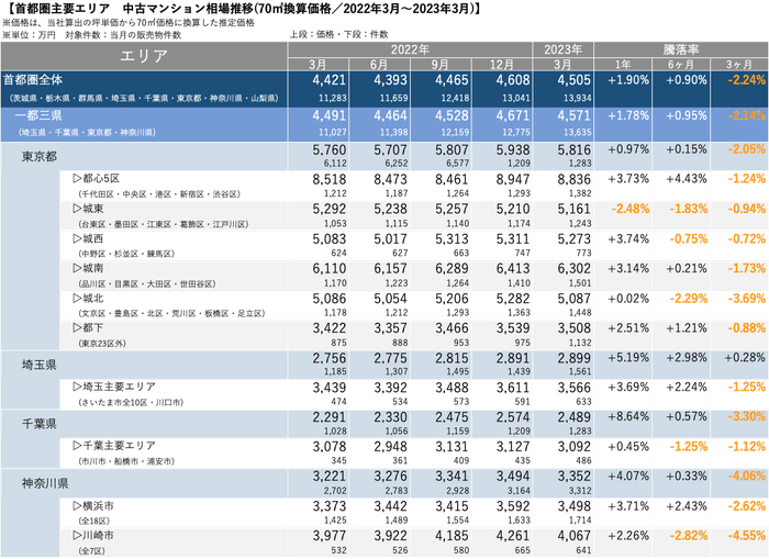 「マンションレビュー」2023年3月 全国主要エリア/47都道府県 中古マンション相場推移を発表