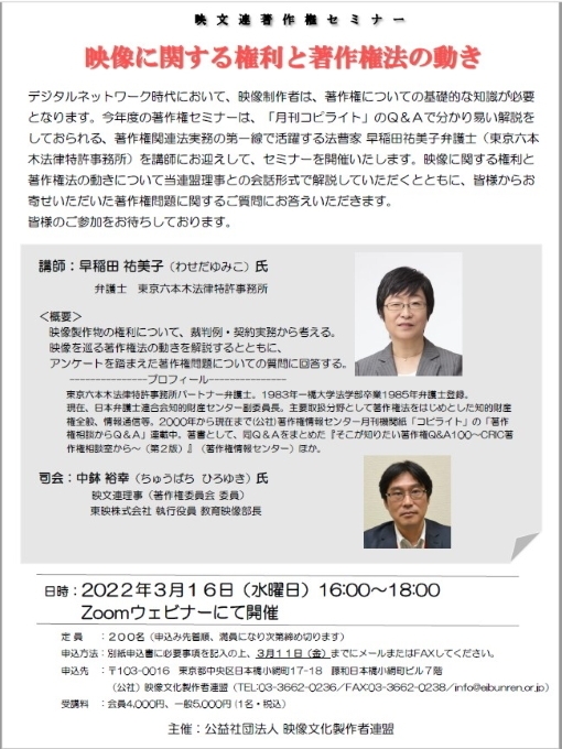 著作権セミナー「映像に関する権利と著作権法の動き」を 3月16日にオンラインにて開催