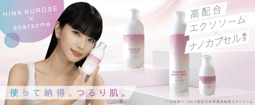 「soarsome(ソアソーム)」は、長年築き上げた原料メーカーとの連携により品質を重視しながらコストを抑え、より多くの皆様に愛される商品として発売しております。本当にこの値段でエクソソーム*1の化粧品が…と驚きの声が多く届いています。「soarsome(ソアソーム)」は、化粧水・美容液・乳液の3ステップのスキンケアラインで、全アイテム共通でエクソソーム*1の配合量が最多となっています。ヒト幹細胞培養液にも含まれている貴重な成分であるエクソソーム*1とは、細胞が放出する微小な胞体の一つで、細胞間の情報伝達の役割を果たしています。高配合*2されることにより細胞間のコミュニケーションが盛んに行われ、肌のハリや弾力などが期待できます。