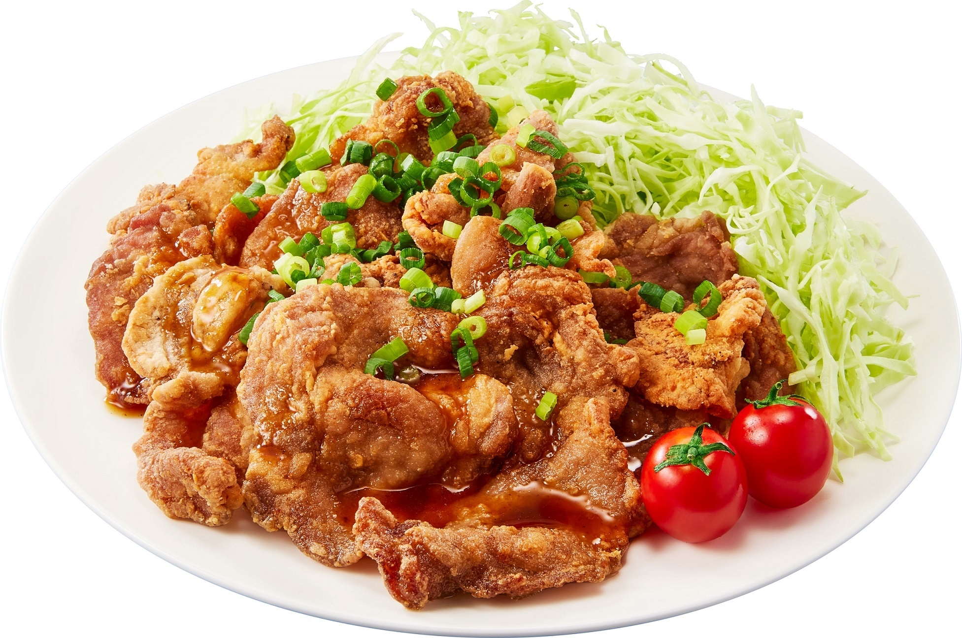 『豚からの素』は、小麦粉・米粉などを用いサクッとした食感に仕上がる「から揚げ粉」、しょうゆに青森県産りんご果汁の甘みと高知県産黄金生姜の風味を効かせた「下味調味液」、しょうゆに高知県産黄金生姜の風味、にんにく・オニオンのコク、コチュジャンの隠し味を加え、酸味の効いたピリ辛味でさっぱりと仕上げる「生姜香る香味甘酢だれ」の3点がセットになった専用調味料です。豚ロースうす切り肉を用いればパリパリとした食感が楽しめ、豚小間肉を用いれば手軽に作れ、厚切り肉なら肉の旨みを感じる一品が味わえます。たっぷりの千切りキャベツとミニトマトを付け合わせに、万能ネギなどをトッピングしてバランスの良い“定食メニュー”が楽しめます。