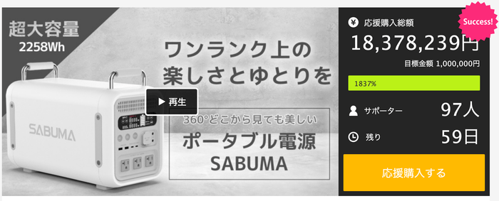 株式会社アピロス(本社:東京都港区)は、360°どこから見ても美しい大容量ポータブル電源 SABUMA(サブマ) S2200を応援購入サービス「Makuake」にて2021年12月21日(火)より先行予約販売を開始し、2021年12月30日現在で応援購入金額1,800万円を突破、達成率は1,800%を超えました。