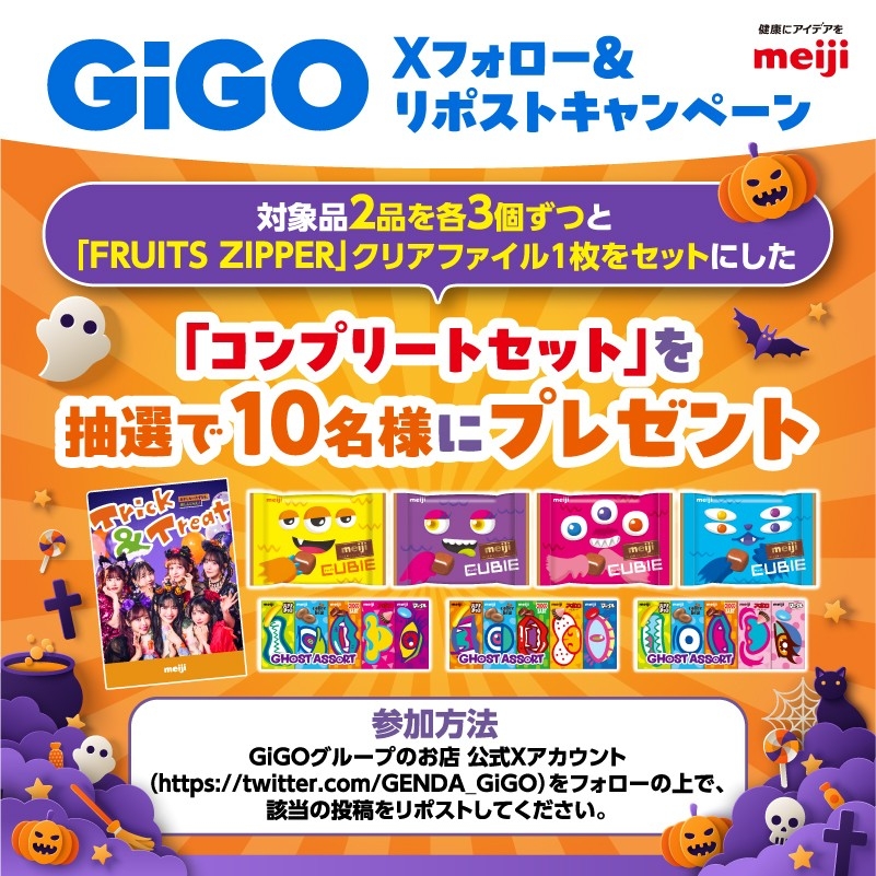 GiGOグループのお店 公式Xアカウント( https://x.com/GENDA_GiGO )をフォローし、該当の投稿をリポストされたお客さまの中から抽選で10名さまに対象商品2品を各3個ずつと「FRUITS ZIPPER」クリアファイル1枚をセットにした「コンプリートセット」をプレゼントいたします。