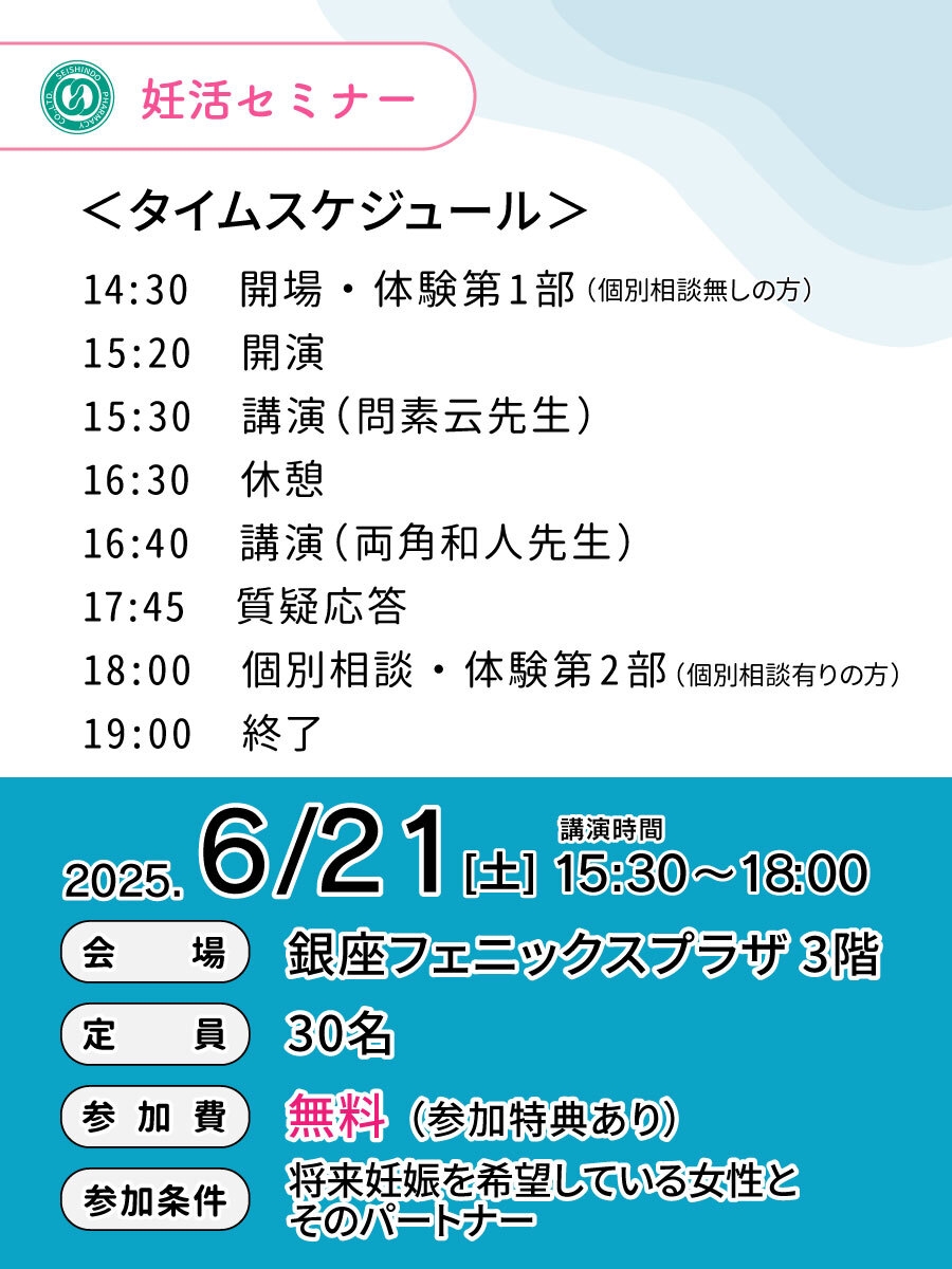 「専門家が妊娠成功の秘訣」を講演する 無料セミナーを6月21日銀座で開催 講師である生殖医療専門医や漢方の専門家との 個別相談&機械測定の体験あり