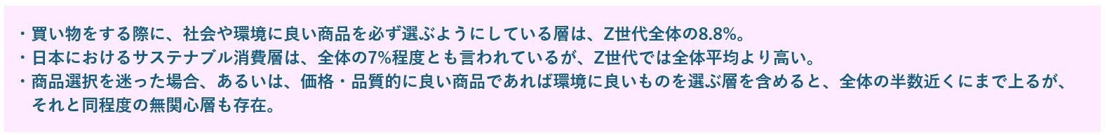 Z世代のサステナブル消費やエシカル消費に関する考え方を調査することで、同世代の消費とサステナビリティーに対する価値観や他世代との違いを把握する。
