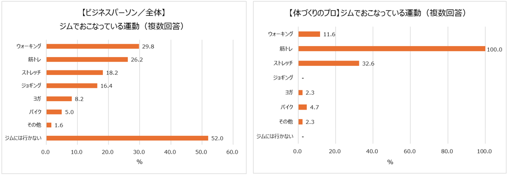 20~50代男女のビジネスパーソンを対象に、ジムに行っているか、ジムでどんな運動をおこなっているか質問したところ、約半数がジムに行っていることが分かりました。ジムでおこなっている運動1位は「ウォーキング(29.8%)」、2位は「筋トレ(26.2%)」でした。体づくりのプロが多く加盟するJBBF(公益社団法人日本ボディビル・フィットネス連盟)にも一部協力いただき、同様の調査を実施。その結果、筋トレに次いでおこなっている運動は「ストレッチ(32.6%)」で、ビジネスパーソンと体づくりのプロでジムの活用方法の違いが見て取れます。